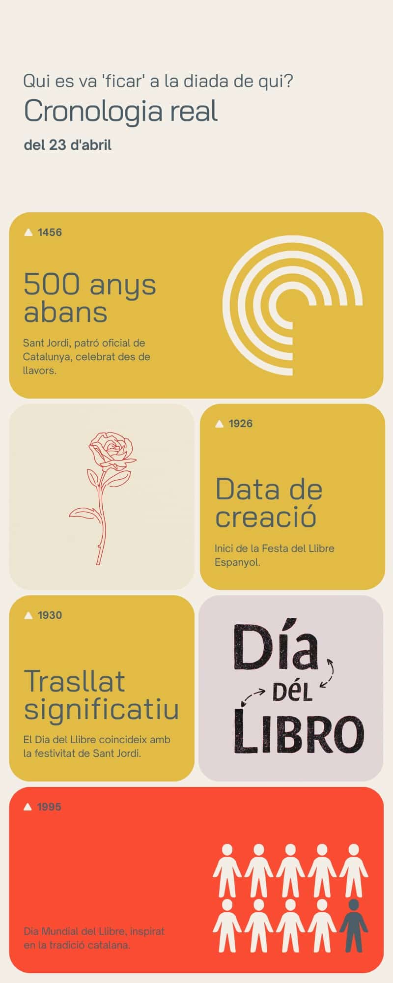 - 1456 → 1930: la Diada de Sant Jordi ja feia 474 anys que era el 23 d’abril a Catalunya.